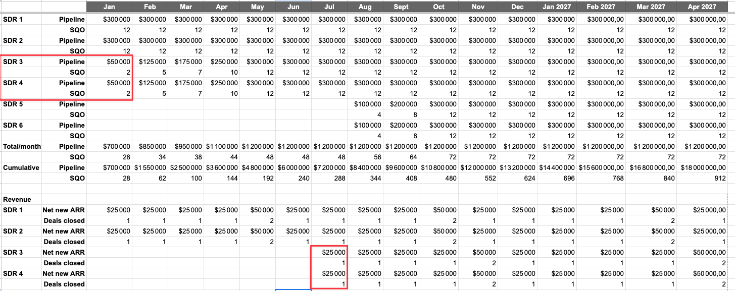 “So: 12 SDRs × 12 SQOs (goal) × conversion rates = pipeline”