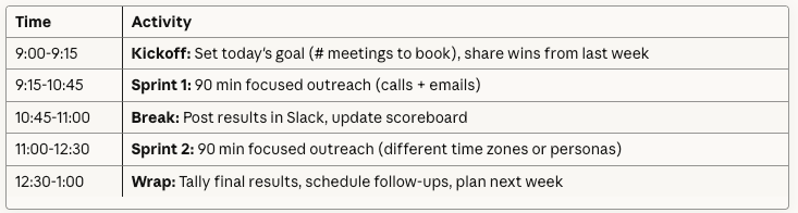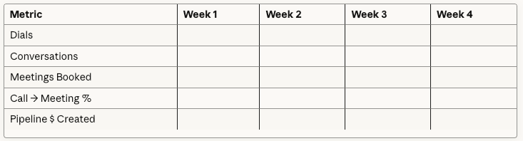 Reality check: The sprint creates the muscle memory. By Week 4, reps should be prospecting daily without needing the structure.