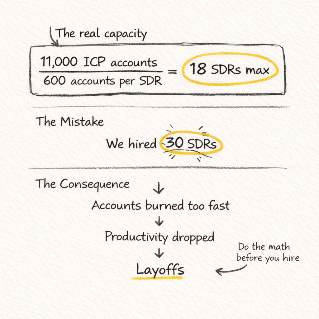 We over-hired. Gave reps “enough accounts.” But many had near-zero probability of converting. Productivity dropped. Eventually, we laid off part of the team.
