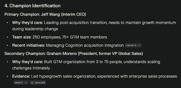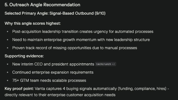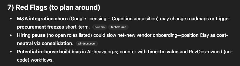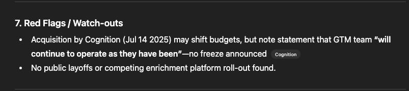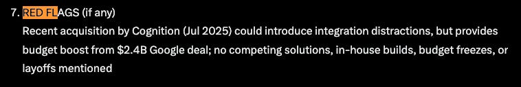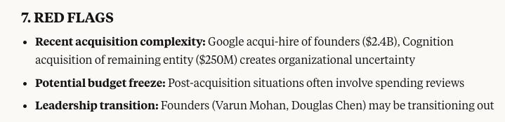The standout: When analyzing red flags, it didn't just list them - it explained how the leadership exodus (Varun and Douglas leaving) creates both risk and opportunity for vendors.