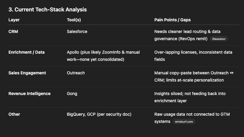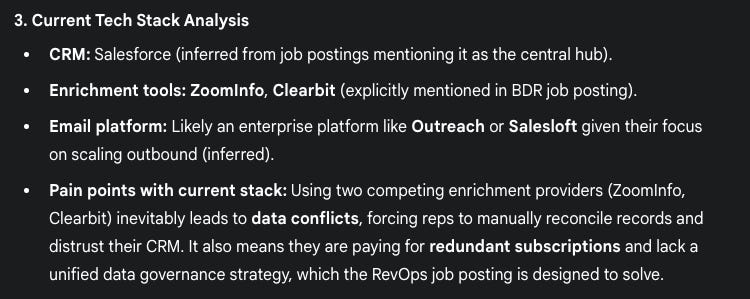 Returned the complete tech stack with sources. Use words from the RevOps job description to find pain points about their tech stack.