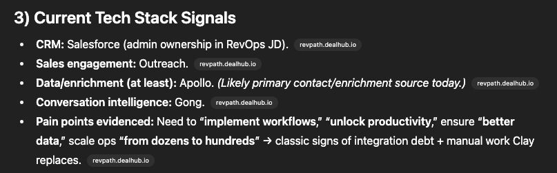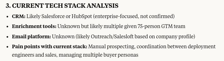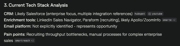 Tech stack without source links - can't verify. It found Salesforce. The reasoning piece is interesting, but not relevant if it's not using the right data.