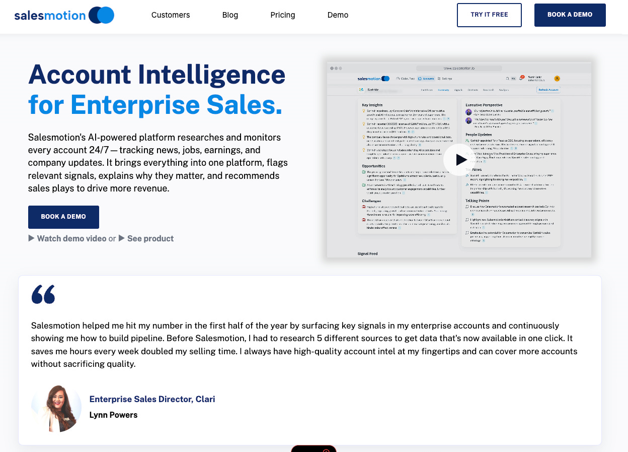 Salesmotion solves the manual account research problem. Instead of reps spending 6+ hours per week searching Google, reading annual reports, and piecing together context from 5+ different sources, Salesmotion automatically monitors accounts and delivers briefings.