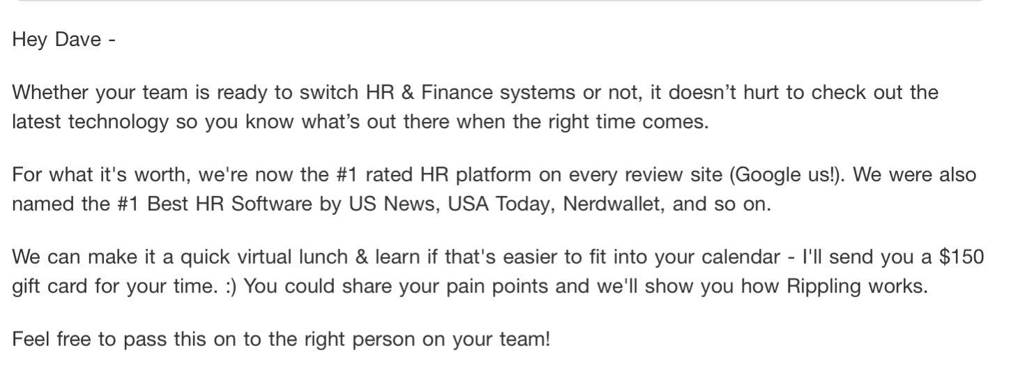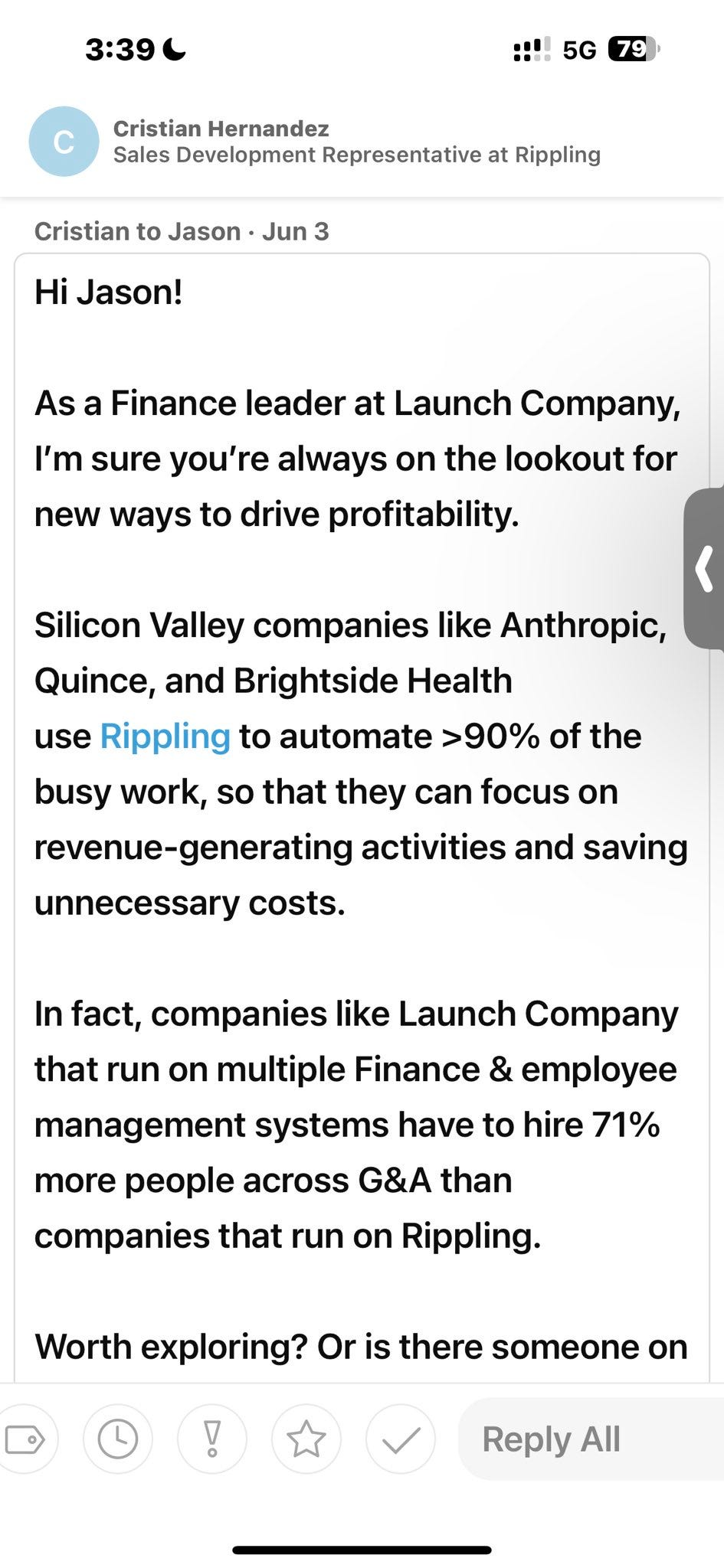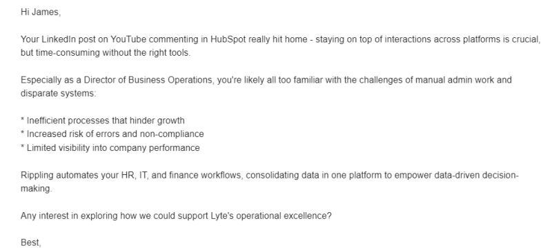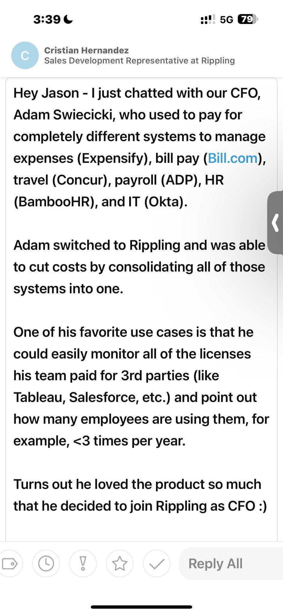 Rippling’s approach isn’t one-size-fits-all—they tweak their messaging based on intent, segment, industry, and persona. While this sequence isn’t groundbreaking, it’s packed with well-timed insights that resonate deeply with the right prospect at just the right moment.