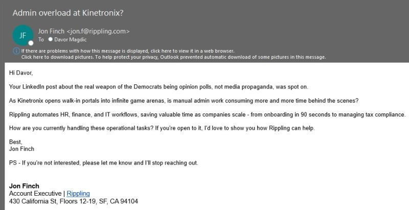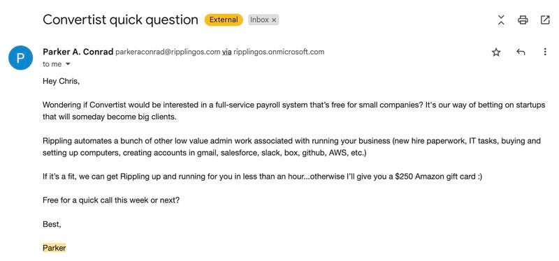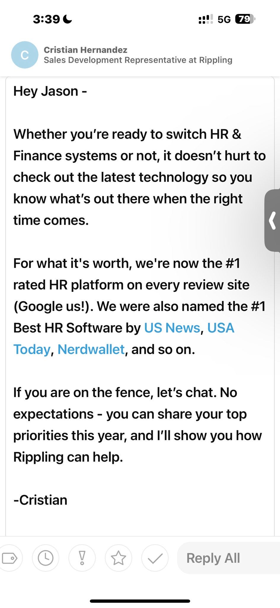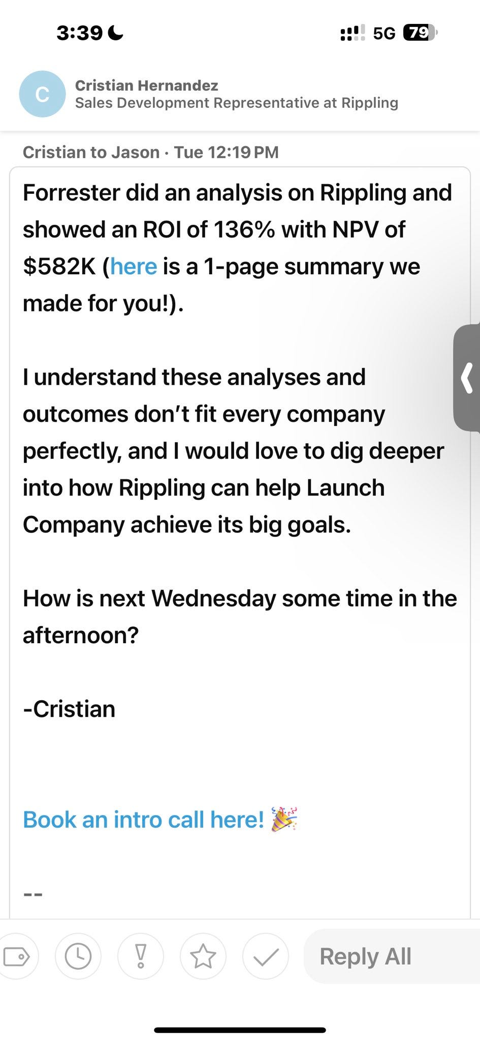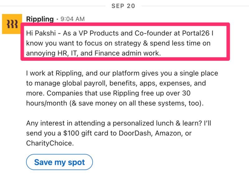 Rippling’s approach isn’t one-size-fits-all—they tweak their messaging based on intent, segment, industry, and persona. While this sequence isn’t groundbreaking, it’s packed with well-timed insights that resonate deeply with the right prospect at just the right moment.