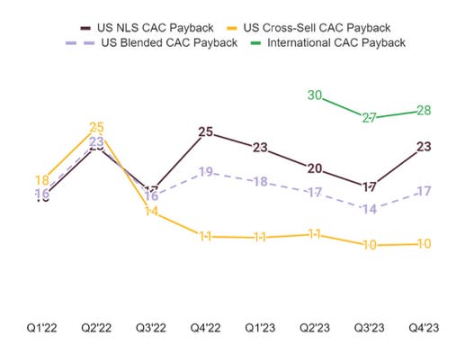 Note: CAC includes the full costs of sales, account management, & marketing (both payroll and marketing budget), as well as the net cash loss from IM and Pro Svcs teams (IM + Pro Svcs 1x bookings, less payroll costs). Expenses are counted within the quarter, except Marketing spend is from the prior quarter. The recurring gross profit added