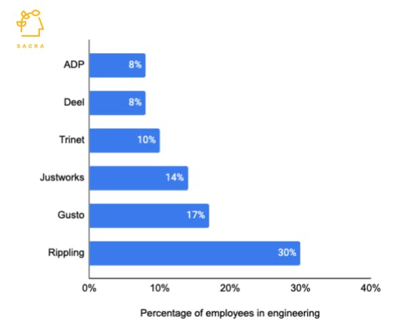 Product Investment: Rippling’s commitment to deep R&D allows it to build multiple business lines simultaneously, an approach that requires significantly more engineering resources than a typical point-SaaS company. Compared to their competitors: 30% of their headcount are engineers.