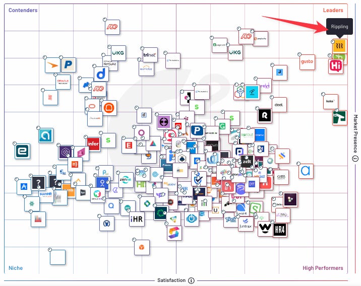 G2 Map Snapshot: There are 677 listings in the Core HR category alone. To put that in perspective, Cognism’s competitive landscape has around 172 competitors—Rippling is playing on a much more crowded field.