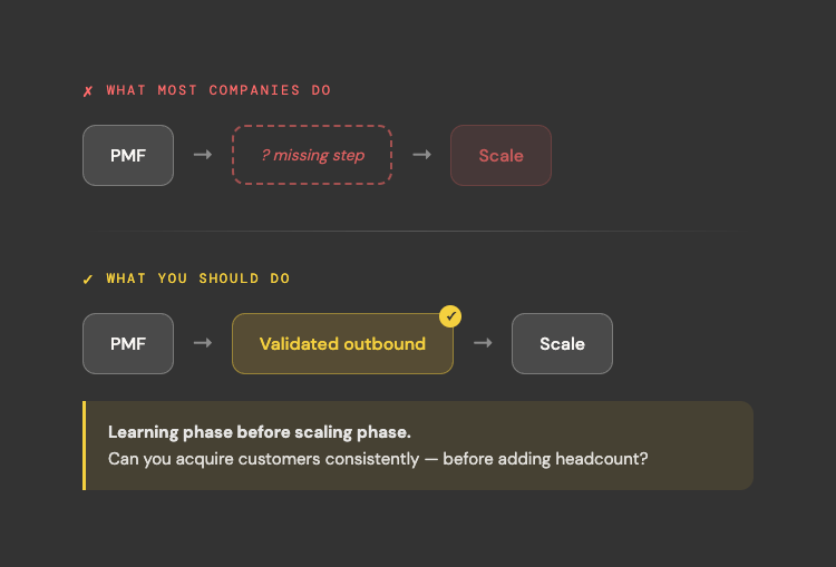 Companies hit product-market fit, then immediately try to scale outbound. They hire a team of SDRs, buy a stack of tools, and hope it works.